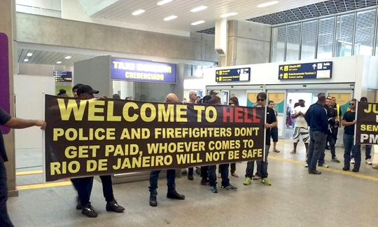 Angry civil police officers staged a strike on Monday, with one contingent greeting visitors at Rio's international airport with a sign reading, in English: "Welcome to Hell. Police and firefighters don't get paid; Whoever comes to Rio de Janeiro will not be safe."