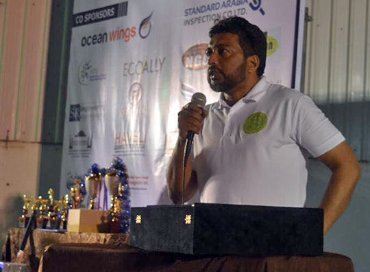 The post tournament closing ceremony presentation was started with the recitation of verses from the Holy Quran by Master Zayd Nasir Sheikh. The Ex-president of JF-Al-Jubail unit, Mr. Fayaz Ahmed welcomed all the spectators and guests. The ceremony moderator Master Zayd invited the Chief Guest, Mr. K. S. Sheikh (Director-Operations, M/s Expertise Contracting Company) to the dais and the organizing committee honored him by presenting a flower bouquet.