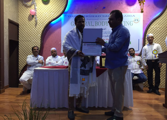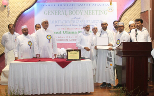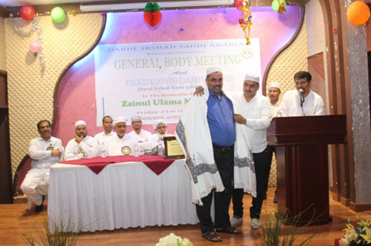 The occasion was also publicized to honor the well-known philanthropist of Saudi Arabia Mr. ZakariyaMuzain.Darul Irshad Saudi Arabia has recognizedhis contribution towards eradication of social causes as part of silver jubilee celebration.Due to his busy schedule, Mr. Zakariya has missed the felicitation function held in Bangalore in the presence of Karnataka chief minister. ZainulUlema Mani Ustad along with the newly elected President Mr. Anwar Hussain GM and Senior Vice President Mr. Kamarudeen felicitated him with memento and award.
