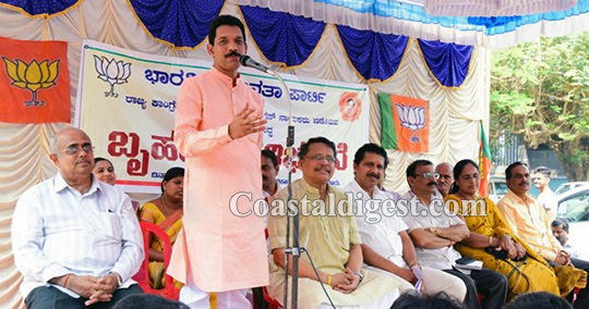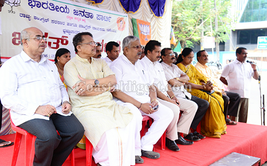 Mangaluru, Feb 20: Even as the Karnataka unit of Bharatiya Janata Party has intensified campaign against ruling Congress party ahead of next year’s Assembly polls, Dakshina Kannada district unit of the saffron party on Monday staged a protest against the alleged corruptions of chief minister Siddaramaih led govt and party in the state.