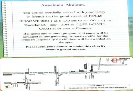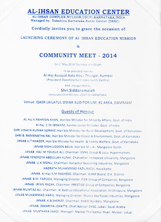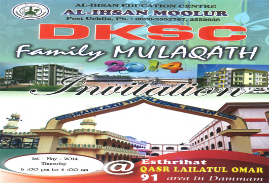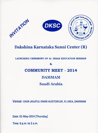 Dammam, Apr 28: Dakshina Karnataka Sunni Centre (DKSC), an organization formed by Muslim Youths in Saudi Arabia in 1995, will organize a huge ‘community get together’ at Qasr Lailathul Omar Auditorium, 91 Area, Dammam in Saudi Arabia on Thursday, May 1, 2014 from 6.00 p.m. to 2 a.m.