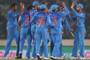 Mirpur, Mar 31: India thrashed Australia with a 73 runs win in their World Twenty20 clash in Dhaka on Sunday, as they topped the group two of the Super-10s with four successive wins.India scored 159-7 as they were sent in to bat first by Australia captain George Bailey and Australia were bowled out for a trifling 86 in 16.2 overs as Ravichandran Ashwin grabbed 4-11 helping India to a 73 run win.