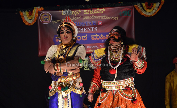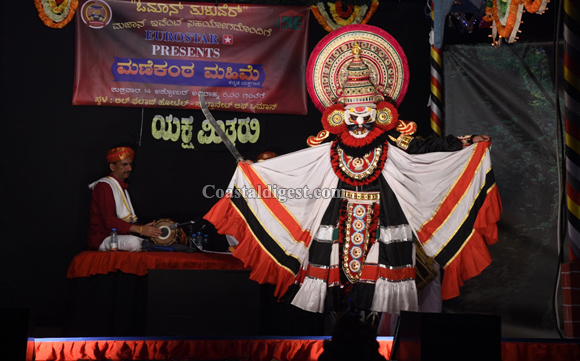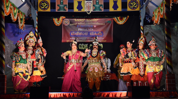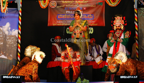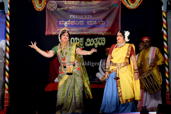 The mridanga , taala and chende synchronized well and the turning effect on the melodious,exquisite renditions by Satish Shetty Patla. The ‘dhiginas’ a notable feature in yakshagana ,were also a part on the prasanga that The duel of steps , dance sequences bet bhasmasura and mohini and the brief episodes in the life of Manikanta was presented.