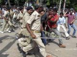 Patna, Oct 28: People thrash a man whom the police detain and take away for questioning after a bomb blast outside the venue of BJP's Hunkar rally in Patna on Sunday.
