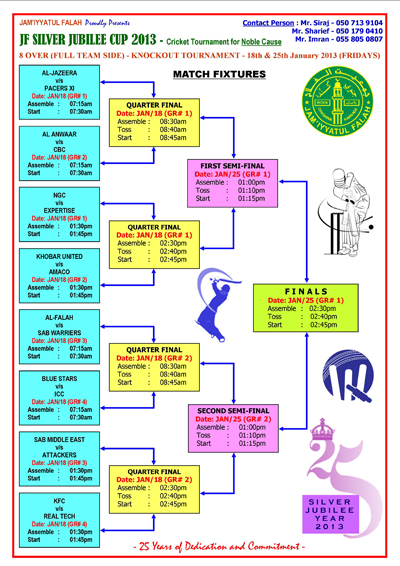 Dammam, Jan 8: In 2013, Jam’iyyatul Falah will celebrate the completion of 25 years of dedication and commitment to the community. To commemorate the silver jubilee year, JF Dammam Unit has planned to organize ‘JF Silver Jubilee Cup-2013’ cricket tournament for a noble cause on  January 18 and 25  at SAB Cricket Academy Ground in Rakah (Dammam-Al-Khobar Highway).