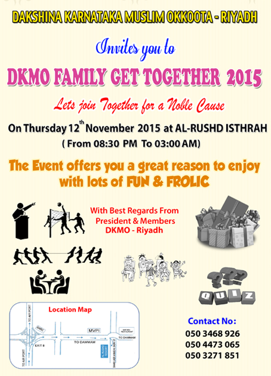 logoRiyadh: Dakshina Karnataka Muslim Okkoota (DKMO) will be organizing a ‘Family Get Together Event 2015’ for a noble cause on November 12 at Al Rushd Istharah Exit 8 Dammam Road, Riyadh.